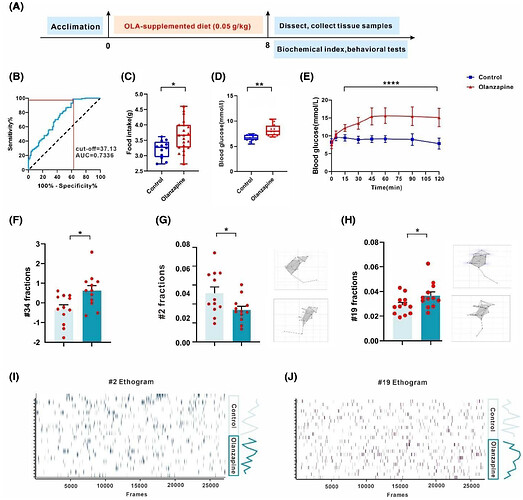 采用一湾生命科技的三维精细行为分析动物的自发行为发现:奥氮平组小鼠原地嗅探行为显著减少(图1G,I),而小跑和行走嗅探行为显著增加(图1F-J),提示奥氮平诱导小鼠精细行为改变,促进探索性嗅探并增加摄食倾向。