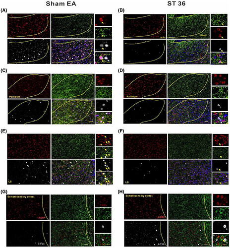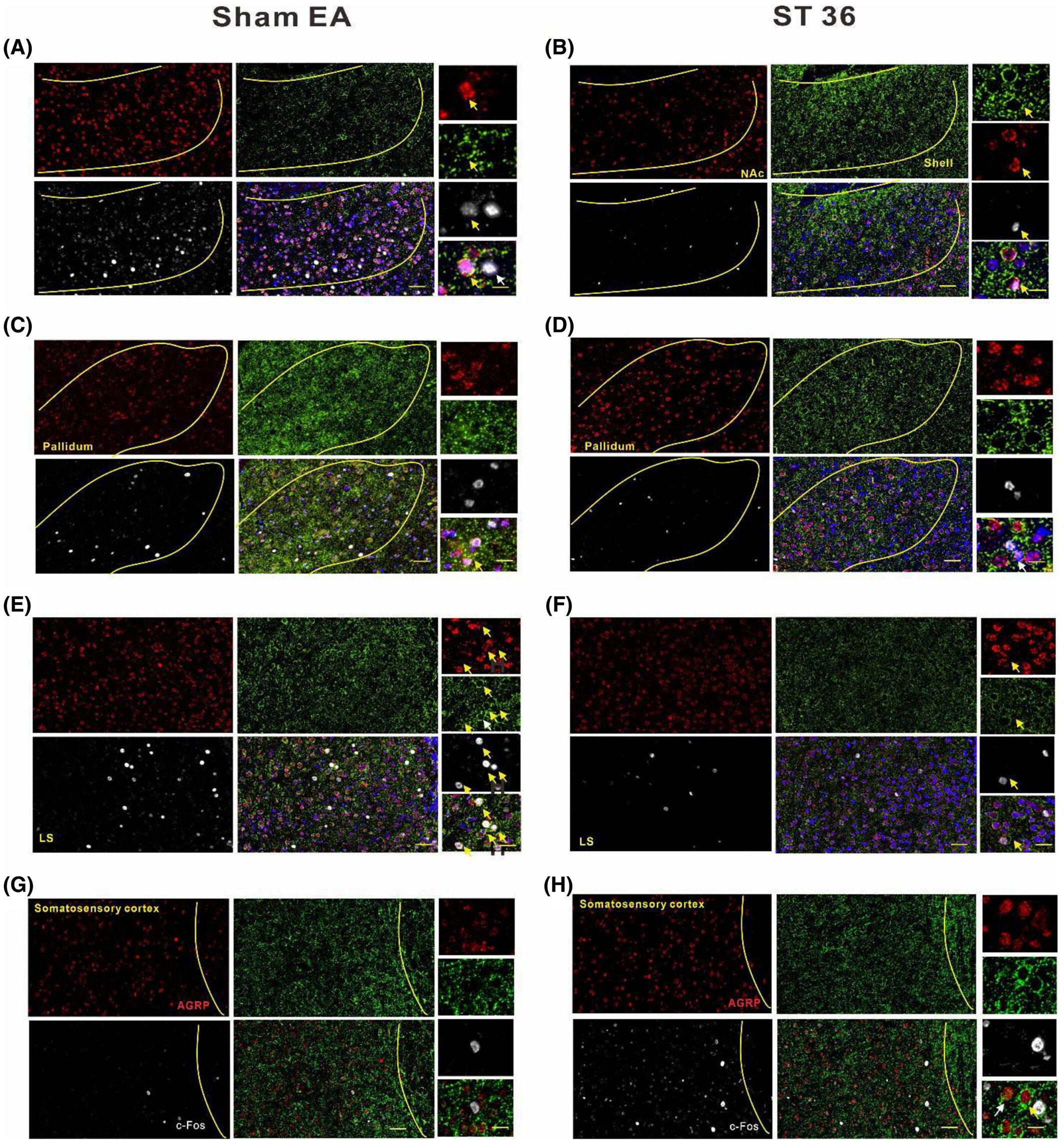c-Fos 与 AGRP 等共染色显示,外侧隔核、伏隔核及苍白球中 c-Fos+/AGRP + 神经元数量显著减少(图6),躯体感觉皮层中多数表达 c-Fos 的神经元激活增强。结果表明,电针 ST36 时,外侧隔核、伏隔核及苍白球中失活的 AGRP+ 神经元是肝脏的跨 突触 上游神经元。