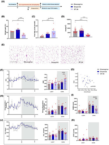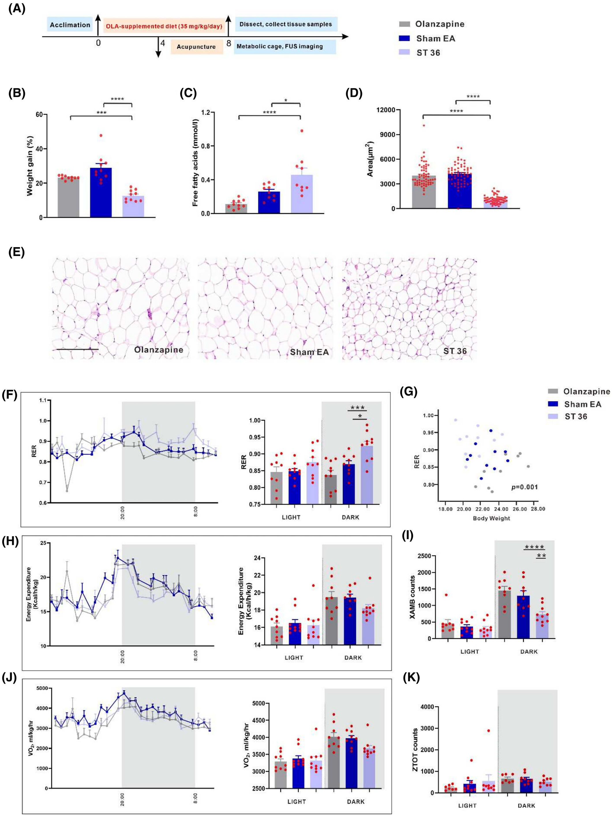 代谢笼监测显示:奥氮平组呼吸交换率(RER)下降,而ST36电针组RER值显著恢复(图2F, G),且该恢复与运动活性无关(图2I)。能量消耗、耗氧量(VO₂)及垂直运动活性(ZTOT)未受电针调控(图2H-K)。电针ST36通过逆转奥氮平引起的RER下降及FFA代谢紊乱,有效改善代谢异常。