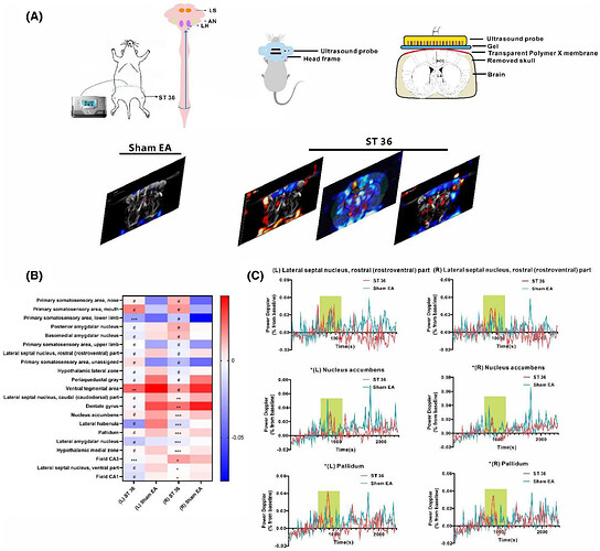 为探究 ST36 治疗的中枢机制,论文利用功能性超声成像(fUS)评估其疗效,检测了大脑大部分区域的活动:范围从 ST36 3 mm 到 ST36 -3 mm(图4A)。扫描显示,同侧及对侧躯体感觉皮层均呈强激活,而外侧隔核、伏隔核、苍白球及下丘脑较假针刺组显著抑制(图4B, C)。躯体感觉皮层同步激活提示针刺影响躯体感觉神经功能;其余区域或为电针 ST36 调节奥氮平诱导的体重增加及脂肪酸代谢异常的关键神经环路,可能在抵抗该体重增加中起重要作用。