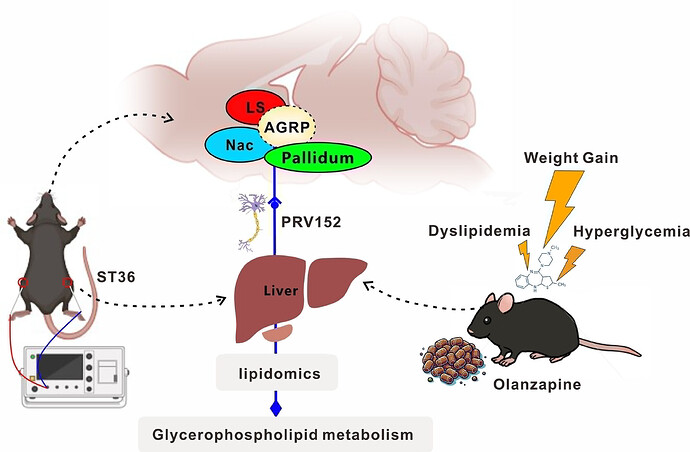 本文发现电针刺激足三里穴(ST36)可改善奥氮平诱导的肥胖及脂代谢紊乱,其机制通过抑制外侧隔核(LS)、伏隔核(NAc)和苍白球中AGRP+神经元活性,重塑肝脑轴代谢调控通路实现。