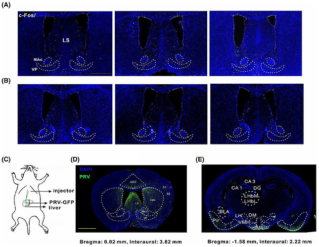 为证实 ST36 穴针刺确实能显著改变上述 fUS 筛选出的针刺反应脑区中神经元的活动,发现针刺组 c-Fos+ 神经元显著减少(图5A, B)。为明确参与这些神经元与肝脏连接的神经元特征,向成年雌鼠肝脏注射编码 EGFP 的 PRV 以逆行跨突触标记上游神经元。注射后 4-5 天,双侧躯体感觉皮层、尾壳核、外侧隔核、伏隔核及苍白球可见 EGFP + 神经元簇(图5C-E),而对照组这些区域无标记神经元。