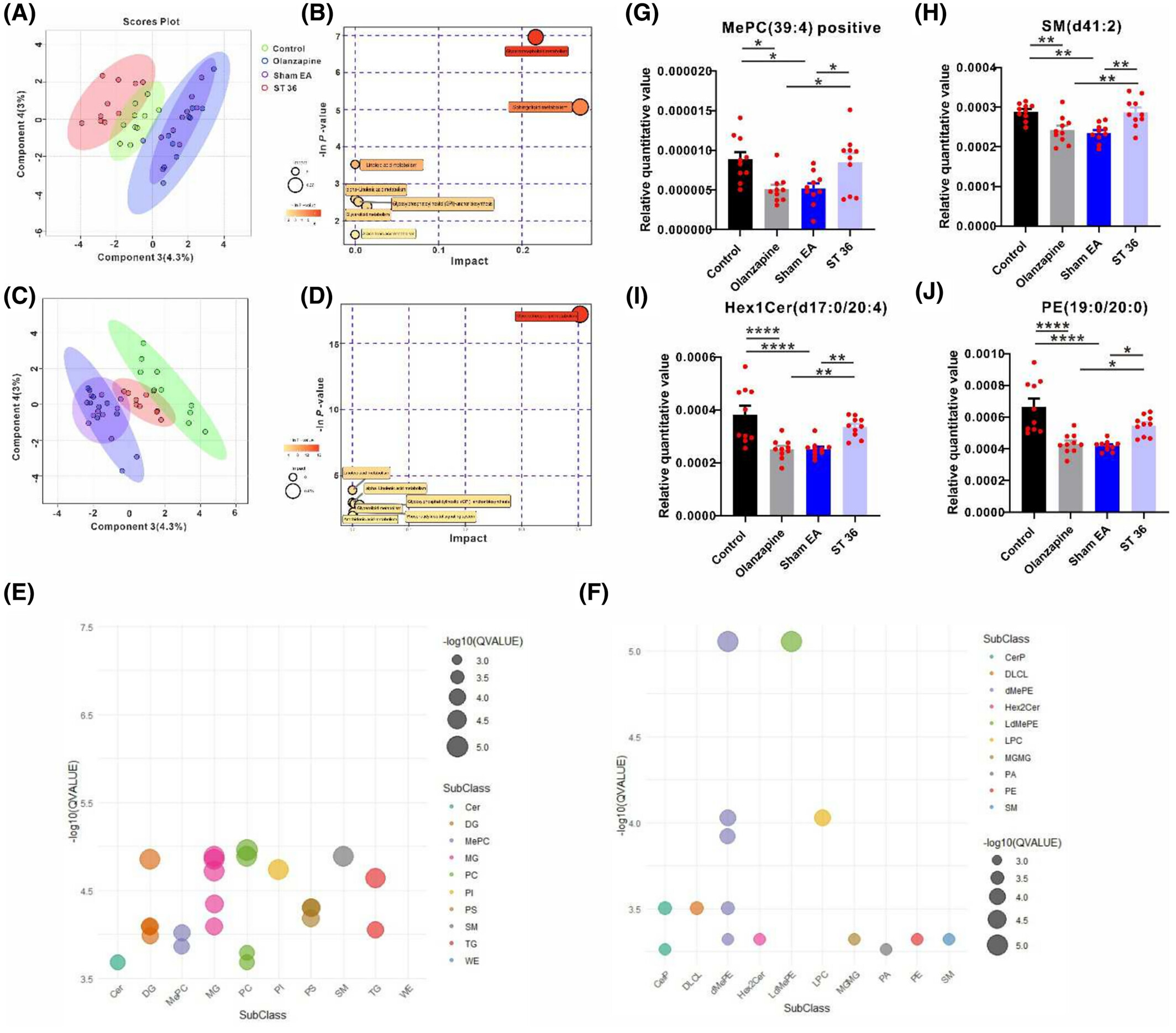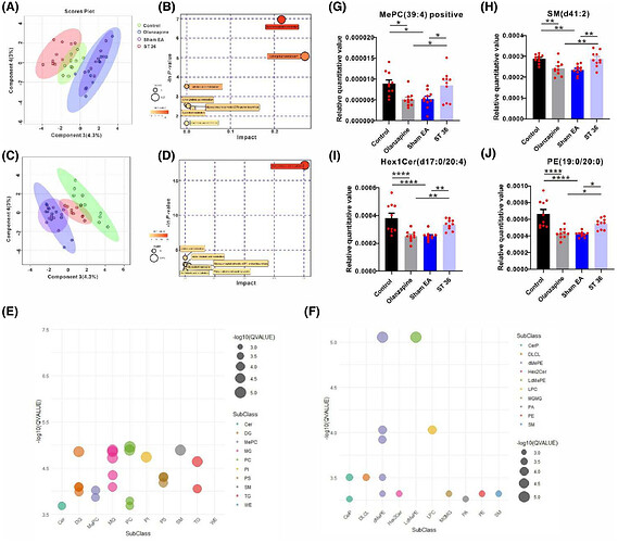 为明确奥氮平处理后的脂质代谢变化及差异脂质生物标志物,采用液相色谱 - 质谱联用技术对各组小鼠肝脏进行非靶向脂质组学研究。稀疏偏最小二乘判别分析显示,假电针组与奥氮平组脂质谱聚类,显著区别于ST36组和对照组(图3A 正检测模式;3C 负检测模式)。KEGG通路分析表明差异脂质主要富集于甘油磷脂代谢、亚油酸代谢及GPI锚定生物合成通路(图3B 正检测模式;3D 负检测模式)。正检测模式中,神经酰胺、甘油二酯、甲基磷脂酰胆碱等脂质亚类差异显著(图3E);负检测模式中,己糖神经酰胺、磷脂酰乙醇胺、鞘磷脂等脂质亚类差异显著(图3F)。关键差异分子包括POC-MePC、NEG-SM、NEG-Hex1Ce、NEG-PE(图3G-J),ST36电针组上述脂质水平均恢复至近对照组状态。