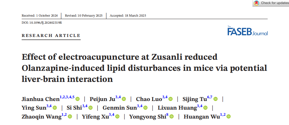 Chen J, Ju P, Luo C, Tu S, Sun Y, Shi S, Sun G, Huang L, Wang Z, Xu Y, Shi Y, Wu H. Effect of electroacupuncture at Zusanli reduced Olanzapine-induced lipid disturbances in mice via potential liver-brain interaction. FASEB journal : official publication of the Federation of American Societies for Experimental Biology.
