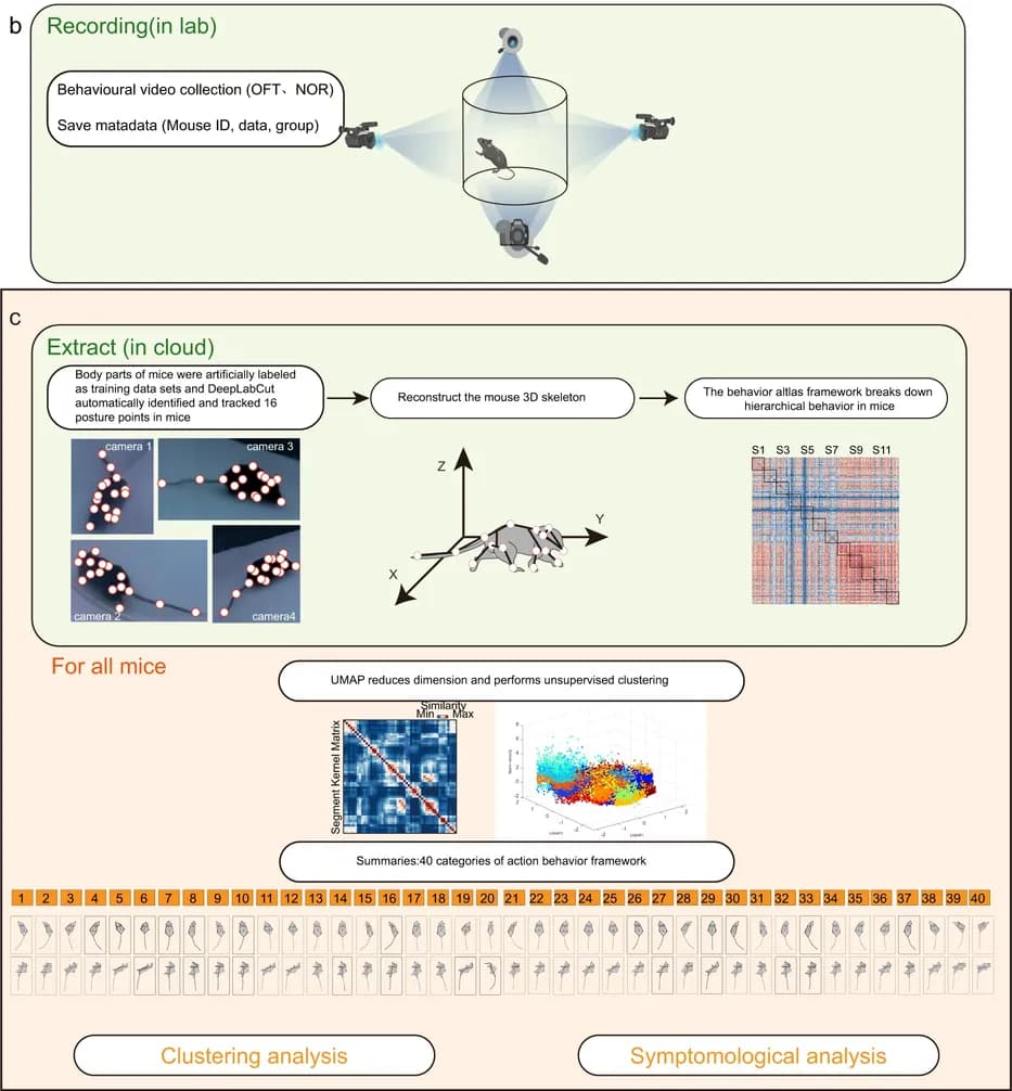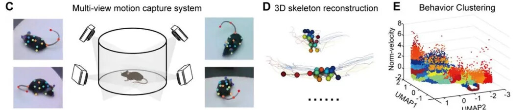 *BehaviorAtlas Analyzer 数据处理软件:从多视角视频中,基于 AI 算法提取动物多个部位的身体坐标 ,进行三维重建后,将动物的行为分解成多种行为亚型序列。