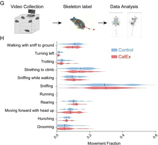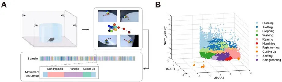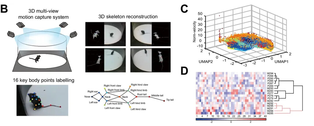 下图展示了 (A) 通过三维运动学习框架进行小鼠行为记录与分析的核心工作流程,并通过三维散点图展示单只小鼠的11种行为组分的时空特征分布 ,(B) 随后展示了 11 种行为组分相应的 3D 骨架,分别比较分析对照组和实验组不同运动类型的占比。