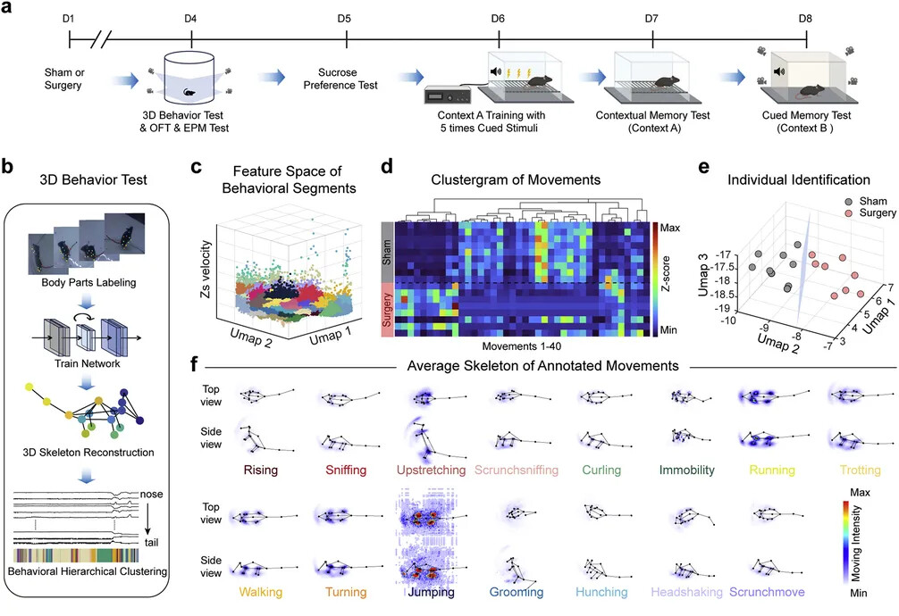 流程图展现了 (a) 3D-AI动物行为分析系统的简易模型 ,以及 (b) 核心工作流程 ,随后 (c-f) 通过行为数据可视化 ,辅助结果解读。