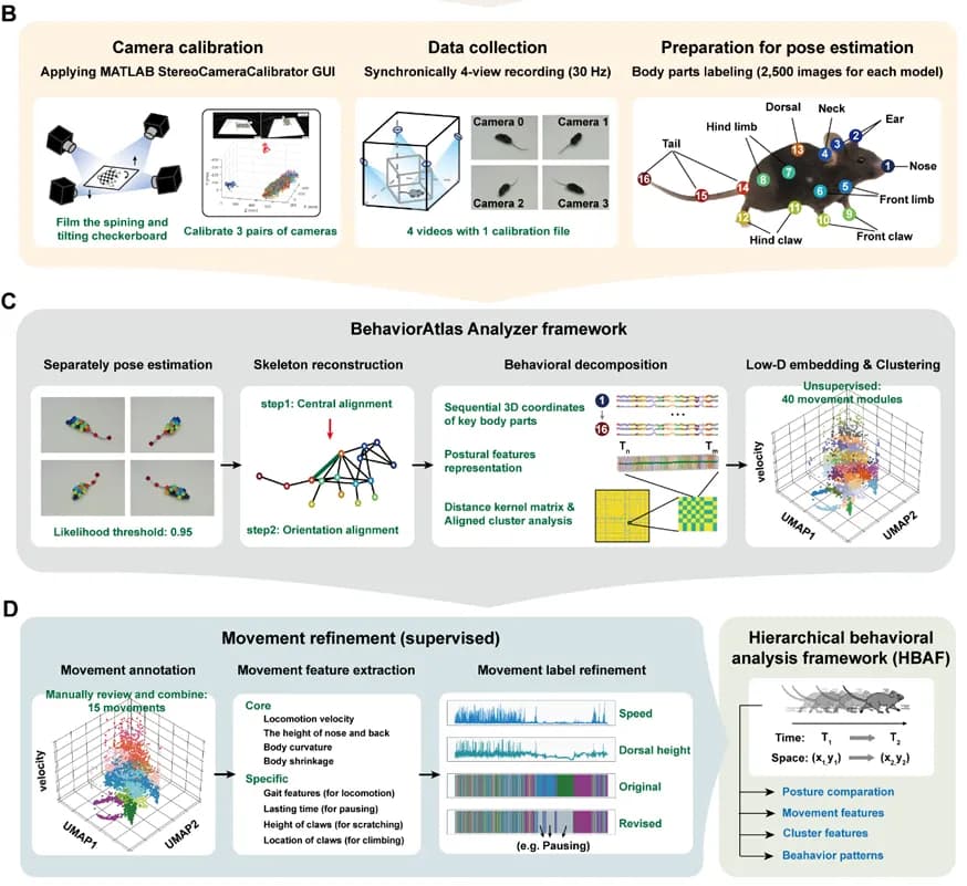 流程图完整呈现从实验设计到结果分析的全链路,关键步骤拆解清晰 :(A) 从实验设计到数据采集和分析的完整流程。(B) 在采集自发行为视频前,先对四个深度相机进行校准,并通过标记关键点来建立姿态估计模型。(C) 通过追踪行为视频生成 3D 骨架,随后动态对齐并分割姿态序列为多个运动基元,经无监督聚类得到 40 种未标注的包含行为模块的运动类型。(D) 随后通过监督方式进行运动类型的标注、特征提取与验证,以识别构成自发行为的运动及其集群。使用层级行为分析框架进行进一步分析。