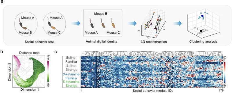 下图流程设计相对而言简洁明了,聚焦于核心步骤 :(a) 实现小鼠社交行为测试记录与动物数字身份识别,进一步进行三维姿态分析的工作流程。分析结果 (b) 包含全体小鼠距离图谱的社交行为谱和 (c) 四组小鼠社交行为模块的聚类图谱。
