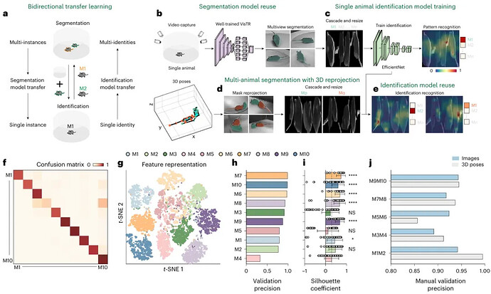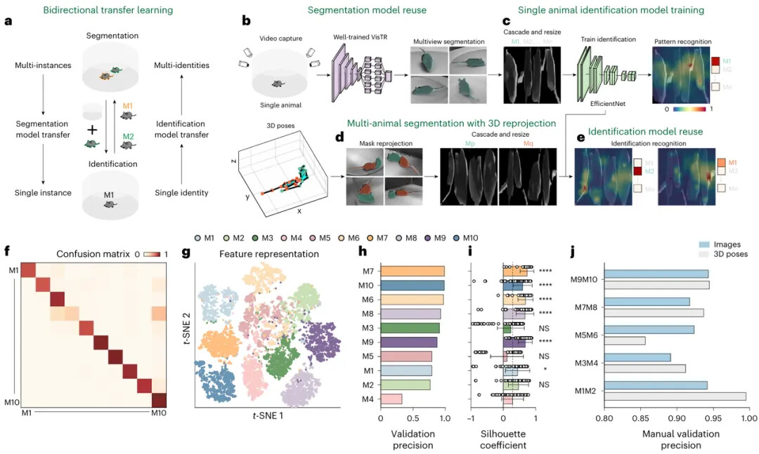 在社交场景中,区分外形相似的动物是一个巨大的挑战。SBeA 采用了一种创新的 “ 双向迁移学习 ” 策略,训练良好的多动物分割模型可以移植到单动物视频中,训练良好的单动物身份识别模型也可以移植到多动物视频中,有效减少了对动物身份的人工标注(图 3a-e)。为了评价 SBeA 在多动物数据中的鉴别性能,研究用 10 只小鼠进行了自由社交实验,通过识别模型区分成对小鼠的身份(图 3f-i)。与手动验证比较,这种方法识别成对小鼠的总体精度超过了 85%(图 3j),表明了该模型在多动物身份识别中的高效率和可行性。