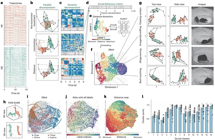 在姿势跟踪之后,将带有动物身份的轨迹映射到低维空间是必要的,以获得对行为的见解。该研究在 BehaviorAtlas 3D-AI 动物行为分析的基础上,拓展到多动物社交场景中。除了考虑单一个体的运动(locomotion)和非运动(non-locomotor)姿态外,还并行地加入了第三个关键维度——动物间的距离,从而在低维空间中构建出 “ 社交行为图谱 ”(图 4c-f)。最后,通过人工识别和定义这些模块所代表的的社交行为(如追逐、理毛、嗅探等,图 4g)。随后,研究人员使用公开的 PAIR-R24M 数据集对 SBeA 进行验证,结果显示,SBeA 不仅能成功区分数据集中预设的三种社交行为(靠近、追逐、探索),而且其分类结果与动物间的实际物理距离变化高度一致(图4h-k)。