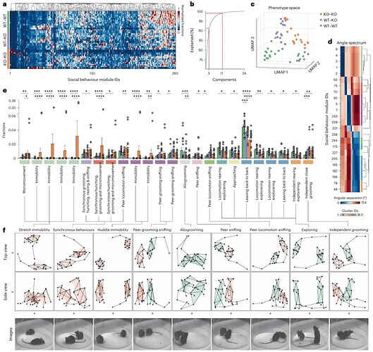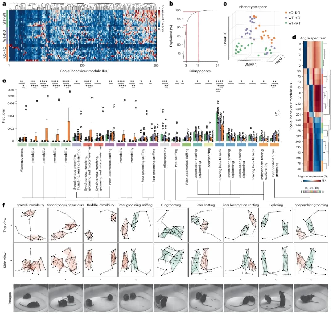 为了测试 SBeA 是否可以实际应用,研究人员首先选择了自闭症(Shank3B -/-)动物模型,比较了野生型(WT-WT)、野生型与敲除型(WT-KO)以及敲除型(KO-KO)三组社交行为的差异。SBeA 自动识别出 260 个社交行为模块,并通过降维和聚类,成功在表型空间中将三组小鼠清晰地分离开(图 5a, c)。进一步,SBeA 被用于识别区分 KO 和 WT 小鼠的微妙社交行为,分析发现,与 WT 小鼠相比,KO 小鼠表现出更少的相互理毛(allogrooming,一种亲社交行为)和探索行为,但同时出现了同步行为(synchronous behaviours)和不同类型的静止不动(stretch immobility 和 huddle immobility,图 5e, f),这些发现表明,SBeA 可以在社交行为的基础上区分遗传突变动物,并识别与遗传突变相关的精细化社交行为模块。