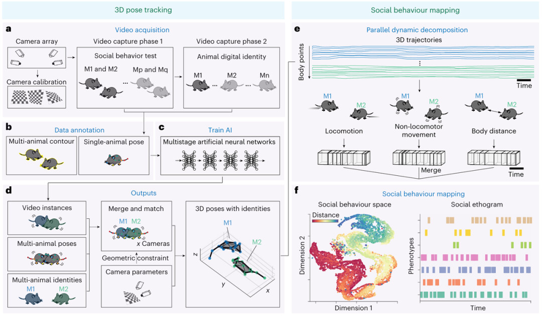 2024年,蔚鹏飞 研究团队[第一作者为韩亚宁(现为南方科技大学医学院研究助理教授/副研究员)、陈可(现为一湾生命科技研发部算法组负责人)、王云珂 ]在Nature machine intelligence 上发表研究论文,通过创新的机器学习方法,构建了一个高效、精准且客观的社交行为分析框架。它不仅解决了多动物 3D 追踪和身份识别的技术难题,更重要的是,它通过无监督的方式实现了对社交行为的精细化、自动化解码,从而能够发现与疾病或基因相关的全新行为标记物,致力于推动行为神经学的边界。