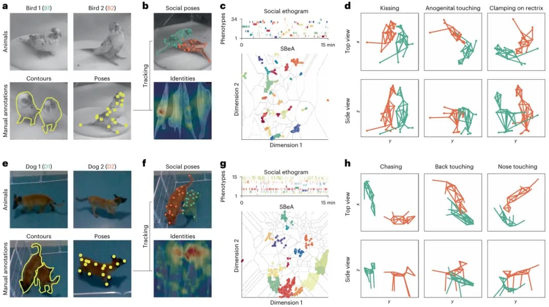 该研究提出的“ 社交行为图谱(SBeA) ”是在 BehaviorAtlas 单动物行为分析的基础上进行的社交行为拓展。该框架通过创新的“ 少样本学习 ”策略,将姿态估计所需的人工标注量锐减数个数量级;同时利用 “ 零标记 ” 的个体识别技术,解决了外观相似动物在复杂互动中的身份混淆问题;并借助无监督学习,自动解码出人类观察者难以察觉的精细社交行为模块。该框架不仅成功运用在自闭症小鼠模型的自由社交行为研究中,还成功拓展于鸟类和犬类的社交行为分析中,证明了其通用性和广阔的应用前景。