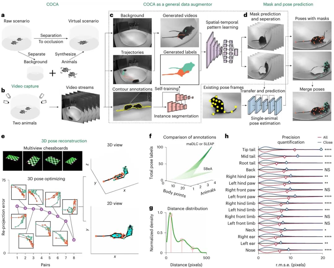 SBeA 引入了一种名为“ 连续遮挡复制粘贴算法(COCA)”的数据增强策略,从少量真实标注的图像中分离出动物和背景,通过程序化地组合他们来生成大量带有逼真遮挡和复杂互动场景的虚拟训练数据(图 2a-d)。这使得模型仅用约 400 帧的手动标注就能达到很高的 3D 姿态估计精度,尤其是在动物近距离接触时,其性能显著优于其他主流方法(图 2e-h)。