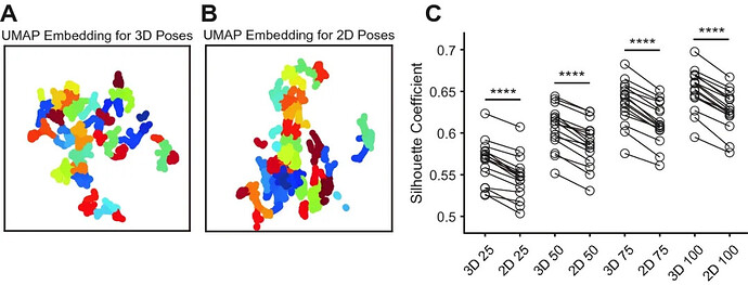 研究团队在两个水平上比较 16 只小鼠的 3D 和 2D 行为数据,证明了 3D 行为数据包含更多表征行为的有效信息。在静态水平上,通过 UMAP 把 16 只小鼠的行为轨迹降维可视化发现,2D 姿态数据的 UMAP 嵌入比 3D 的 UMAP 嵌入更拥挤,在不同聚类类别中,3D 轮廓系数始终显著高于 2D 轮廓系数,这意味着 3D 姿态的 UMAP 嵌入具有更好的聚类质量,能捕捉到 2D 遗漏的细微行为差异(图3)。