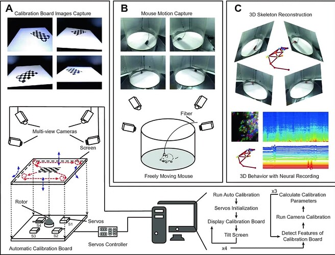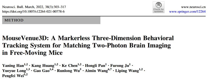 Han Y, Huang K, Chen K, et al. MouseVenue3D: A Markerless Three-Dimension Behavioral Tracking System for Matching Two-Photon Brain Imaging in Free-Moving Mice. Neurosci Bull. 2022;38(3):303-317. doi:10.1007/s12264-021-00778-6