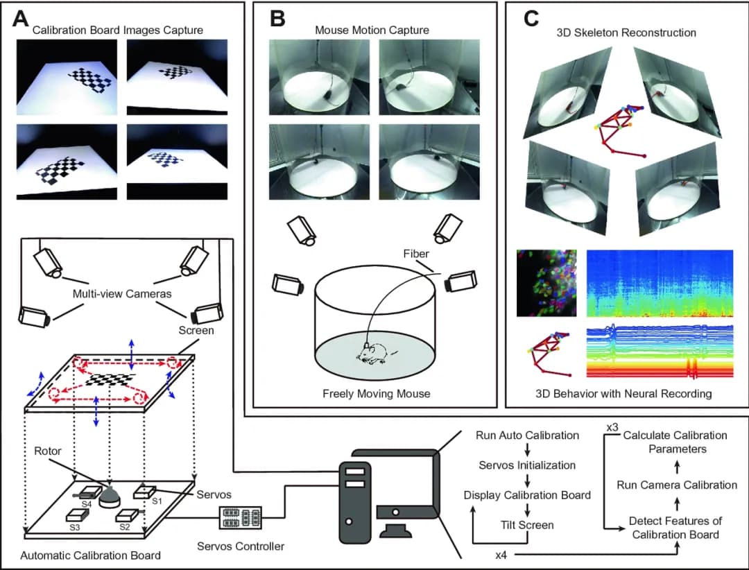 做小鼠行为实验的研究员,可能都有过这样的困惑:明明观察到小鼠在站立(rearing)或理毛(grooming),但单相机拍的 2D 轨迹里,这些依赖高度的行为总被模糊成平面移动,基于单视角视频、简化参数的传统分析,无法精准捕捉动物三维行为;想同步记录行为和神经活动,却总被相机视角、线缆遮挡搞得手忙脚乱,严重限制大脑功能研究精度。