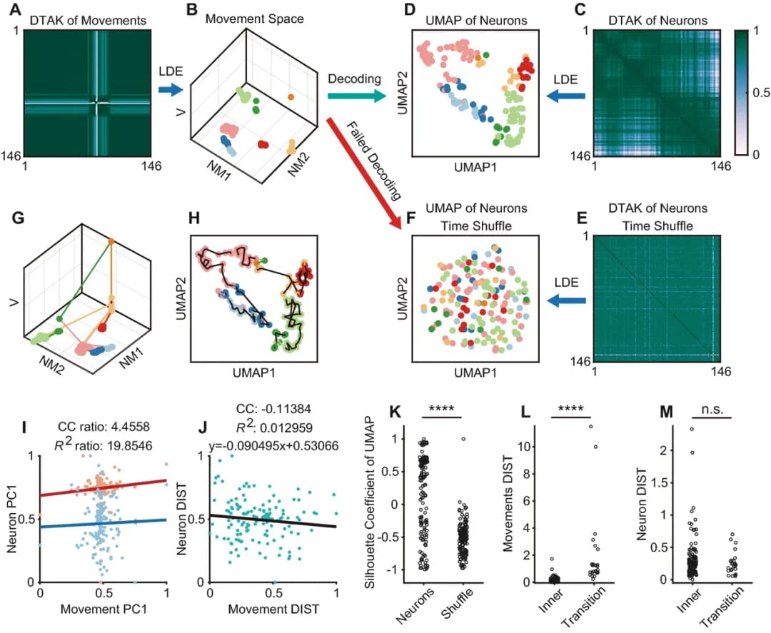 研究将 MouseVenue3D 行为捕捉系统与 FHIRM-TPM 2.0 微型化双光子显微成像系统结合,实现了在圆形旷场中自由运动小鼠三维精细行为与其次级运动皮层中数百个神经元自发活动的同步记录(图5)。使用无监督动物行为分解框架 BehaviorAtlas 同时分解小鼠的三维精细行为和对应的自发神经活动。研究基于动态时间对齐核(DTAK)构建了低维运动表征空间。通过同步分割神经元活动信号,采用相同参数构建了神经元动态特征的距离矩阵。分析发现三维精细行为和对应神经活动模式在特征、神经行为状态模块和状态模块的时间转移方面均存在相关性(图6),显示出三维精细行为对于理解大脑精细功能的重要性。