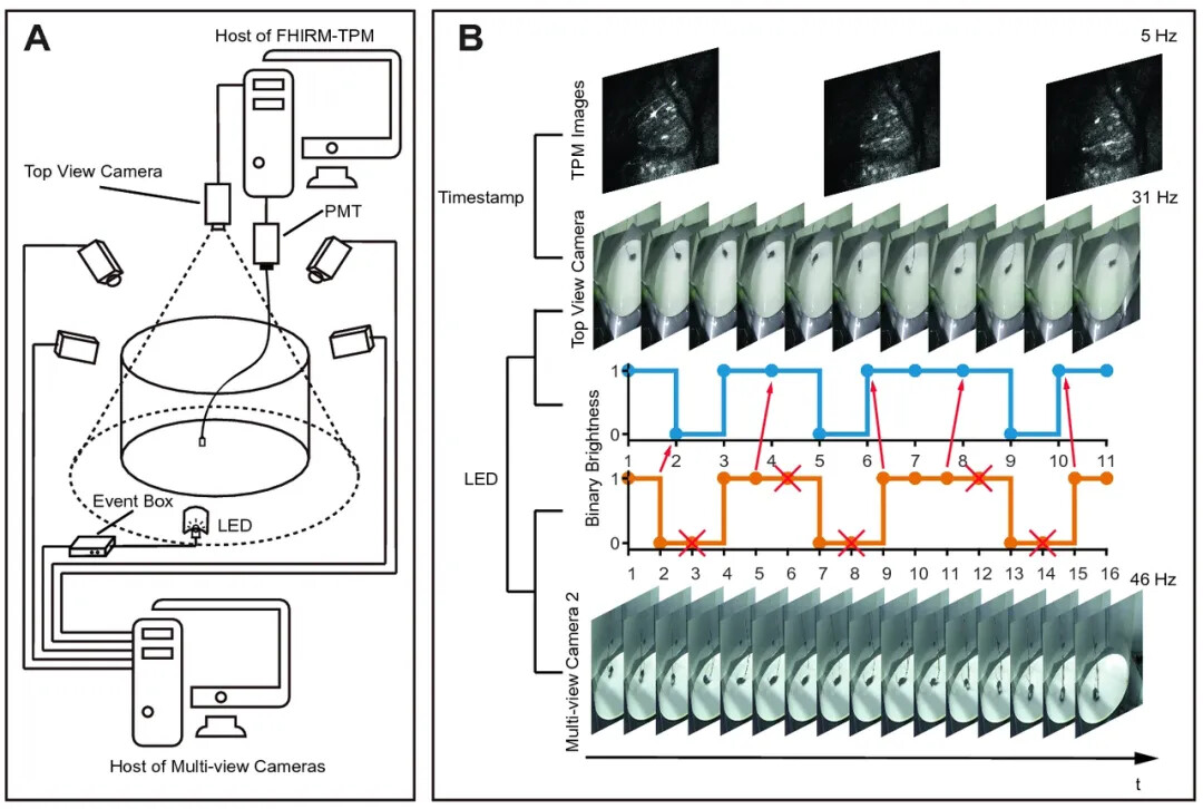 该系统的另一个优势在于,它无需传统的顶部机位拍摄,可以有效解决行为拍摄与神经信号线缆的相互阻碍问题,使用多视角相机以实现 3D 运动捕捉,并且能够匹配由北京大学程和平院士团队开发的微型化双光子成像系统 FHIRM-TPM 2.0,同步记录自由运动小鼠的精细三维行为和神经元的荧光活动(图2)。