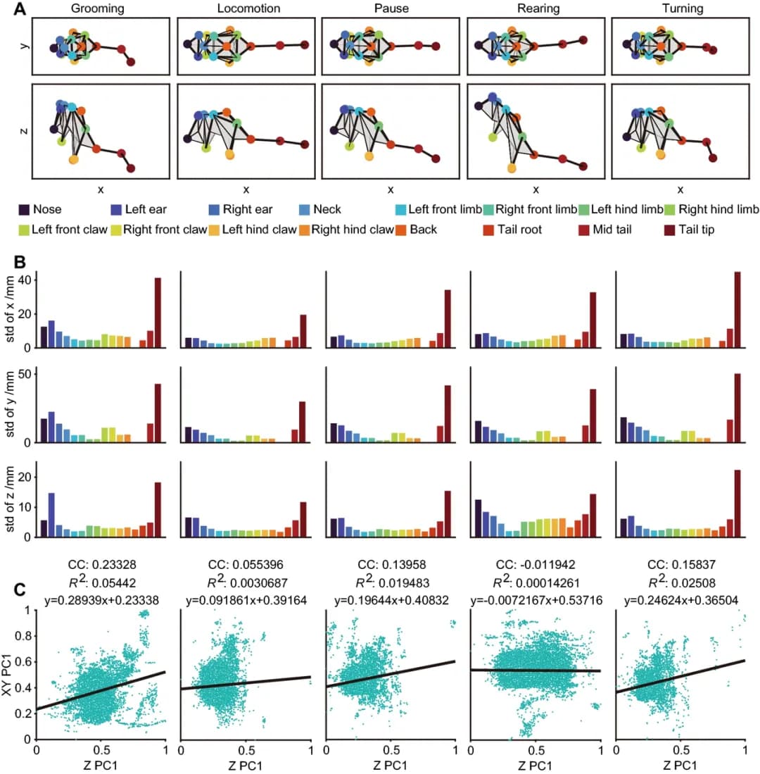 为了比较动态水平的行为数据,团队成员人工标注了 225 分钟的小鼠自发行为视频,共包含五大类行为:理毛(Grooming),运动(Locomotion),停止(Pause),站立(Rearing)和转向(Turning)。经典统计学和主成分相关分析结果显示,XY 轴所包含的信息与 Z 轴包含的信息在不同行为中不存在相关性或仅存在弱相关性,且 Z 轴包含更多区分小鼠站立行为的有效信息,而仅使用 2D 数据进行行为识别可能会将直立等站立行为与其他类型的行为混淆(图4)。该研究在小鼠上验证了捕获动物三维精细行为的优势。