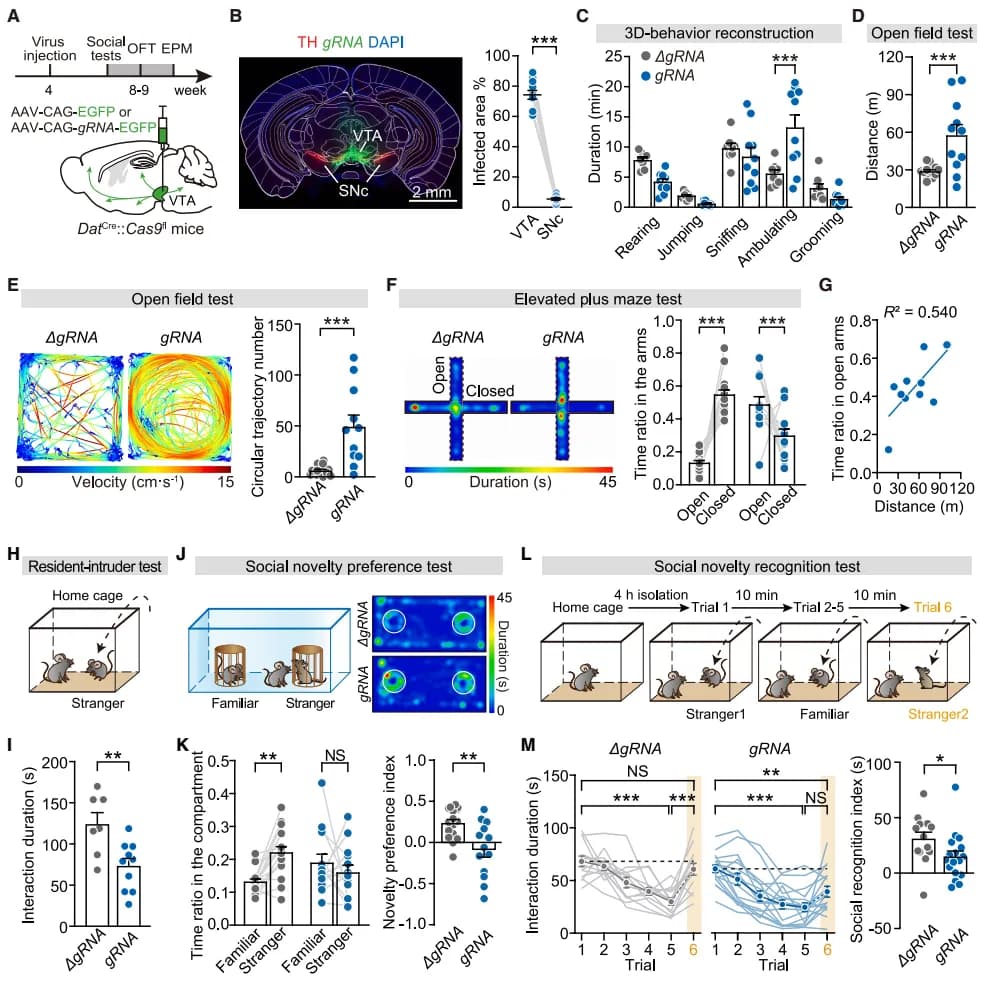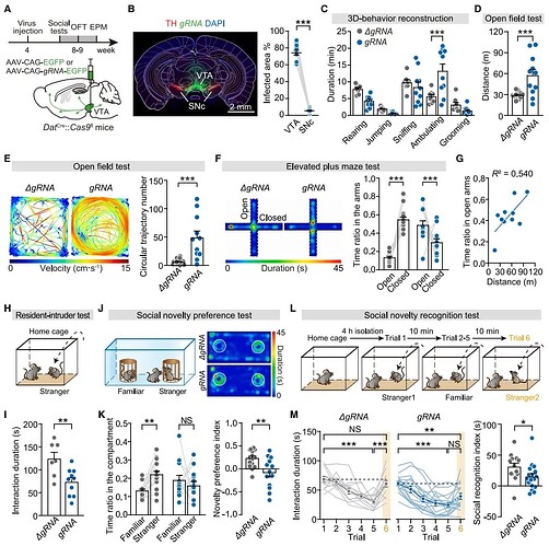 | _ | 社交主动性: 居住 - 入侵范式中,经 4 小时社会隔离的 gRNA 组小鼠与陌生小鼠共笼 10 分钟时,主动社交互动时间显著减少 (图 5H、I); |