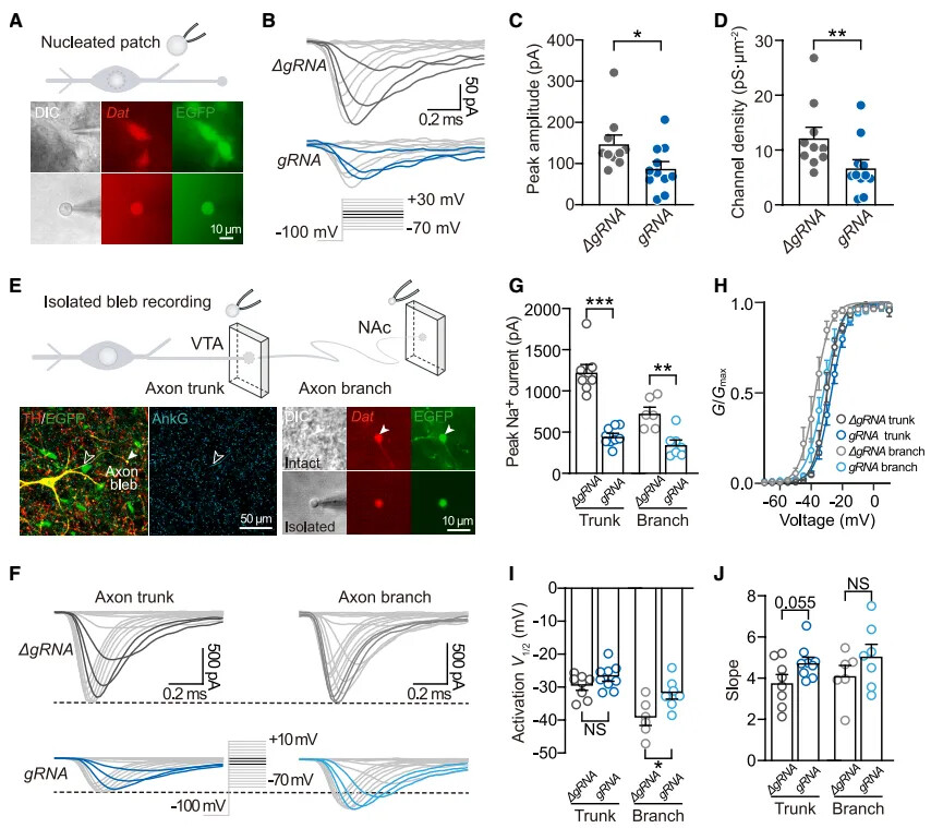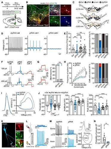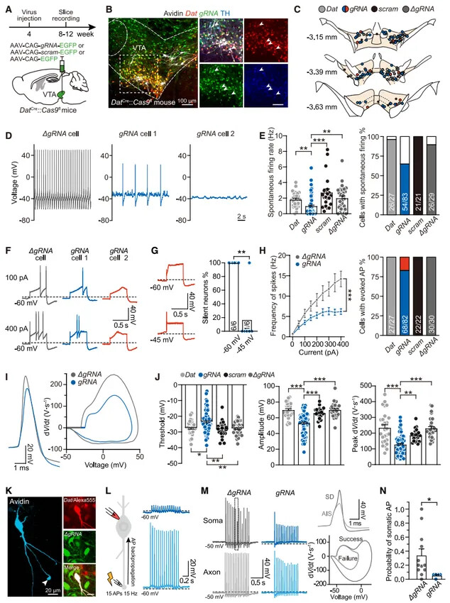为明确 Scn2a 对 VTA 多巴胺能神经元电生理功能的调控作用,研究团队首先通过免疫荧光实验验证 CRISPR-Cas9 技术敲除 Scn2a 的效率(图 1D、E、F)。随后对 Scn2a 敲除组(gRNA 组)和对照组神经元进行全细胞记录,结果显示,gRNA 组神经元的自发放电频率显著低于对照组,代表性放电轨迹图也清晰呈现了这一差异(图 2D、E)。更关键的是,图 2F 的代表性电流刺激响应图显示,约 17.1% 的 gRNA 组神经元即便给予 1 nA 的强电流刺激也无法产生动作电位,即 “沉默神经元” 比例显著升高(图 2G)。