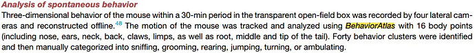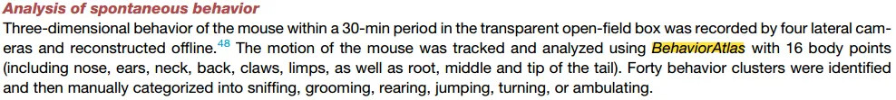 近日,复旦大学舒友生团队通过 BAYONE BehaviorAtlas 3D-AI 动物行为分析系统,追踪小鼠 30 分钟内 16 个身体位点的轨迹,量化出 40 类行为集群,辅助证实 VTA 多巴胺神经元 Scn2a 缺失会导致小鼠出现多动、重复刻板行为及社交新异性偏好丧失等孤独症典型表型。一湾生命科技 BehaviorAtlas 3D-AI 动物行为分析系统为本论文中的行为分析提供强有力的支持!