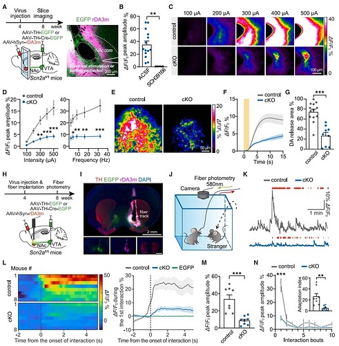 | _ | 体内实验中:自由活动小鼠与陌生同种社交互动时,cKO 组 NAc 区域多巴胺释放峰值较对照组降低 75%(图 4M),且无运动伪影干扰。这些核心结果一致证实,Scn2a 缺失会显著减少 VTA 多巴胺能神经元的多巴胺释放,且 Scn2a 对 DAN 轴突末梢的多巴胺分泌功能至关重要。 |