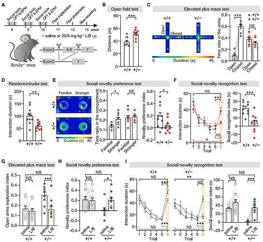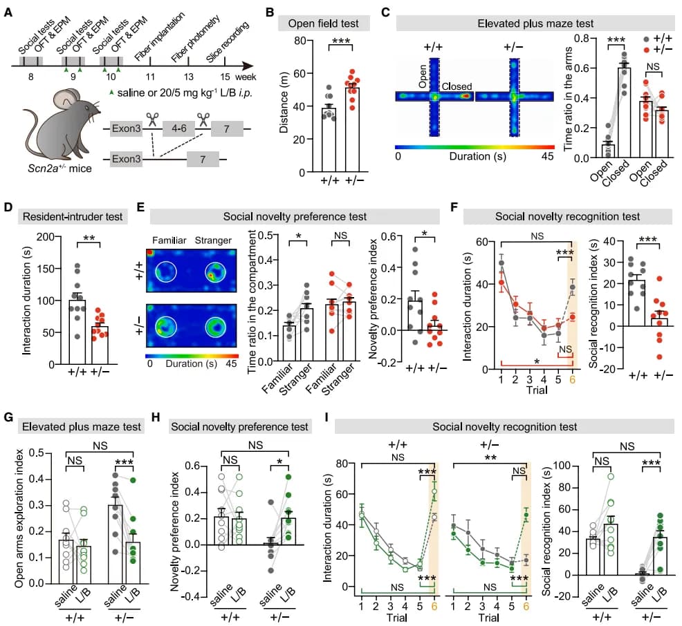 | _ | 药物干预验证: 左旋多巴 / 苄丝肼(L/B)可通过增强多巴胺释放,特异性改善 Scn2a 缺失引发的焦虑异常、社交障碍等非运动症状;且在模拟人类病理状态的 Scn2a+/- 杂合子小鼠中,该干预效果同样显著。 |