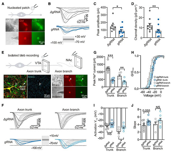 考虑到钠电流是神经元电信号产生和传导的核心基础,在明确 Scn2a 缺失影响神经元兴奋性后,研究团队首先通过膜片钳技术记录胞体钠电流。结果显示,Scn2a 缺失后胞体钠电流显著降低,通道密度减少 46.1%,同时代表性电流轨迹图也清晰呈现 Scn2a 敲除组胞体钠电流幅度明显减小(图 3A、B、C、D)。进一步检测发现,轴突部位的钠电流受损更为严重(图 3E、F、G)。这些结果为后续阐明多巴胺释放异常的机制提供了电信号传导层面的关键依据。