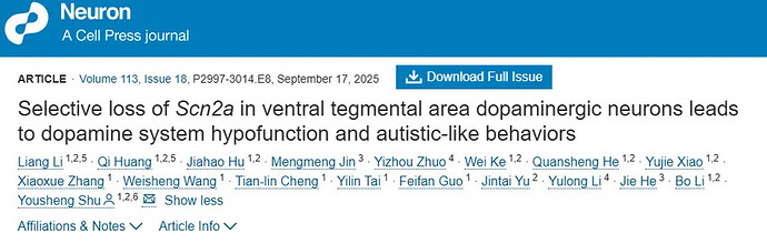 Li L, Huang Q, Hu J, Jin M, Zhuo Y, Ke W, He Q, Xiao Y, Zhang X, Wang W, Cheng TL, Tai Y, Guo F, Yu J, Yulong Li, He J, Li B, Shu Y. Selective loss of Scn2a in ventral tegmental area dopaminergic neurons leads to dopamine system hypofunction and autistic-like behaviors. Neuron. 2025 Sep 17;113(18):2997-3014.e8. doi: 10.1016/j.neuron.2025.06.003. Epub 2025 Jul 10. PMID: 40645182.
