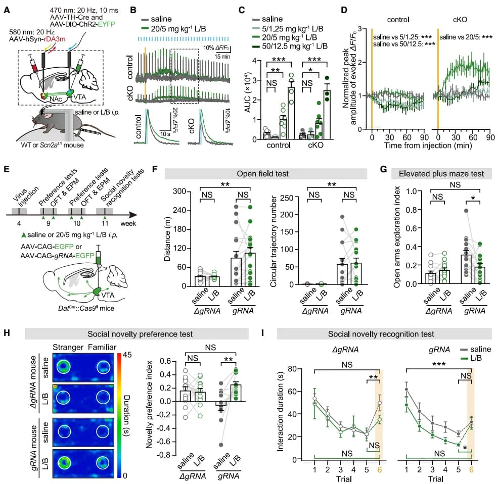 为模拟人类 SCN2A 杂合突变的病理状态,研究团队采用 Scn2a +/- 杂合子小鼠开展验证。行为学测试显示,杂合子小鼠表现出过度活跃和焦虑水平不足,这一运动与焦虑表型,与 VTA DAN 特异性 Scn2a 敲除模型(gRNA 模型)高度相似(图 7B、C);而社交能力缺陷更为显著:居住 - 入侵测试中与入侵者的主动社交互动总时长显著减少(图 7D),社交新奇偏好测试中区分熟悉与陌生小鼠的能力大幅下降(图 7E),社交新奇识别测试中,对第二只陌生小鼠的探索兴趣无反弹(图 7F)。对该杂合子小鼠给予左旋多巴 / 苄丝肼(L/B) 干预后,结果显示 L/B 可显著挽救其焦虑不足表型,并有效改善社交缺陷(图 7G-I)。该结果在更贴近人类 SCN2A 杂合突变病理场景的模型中,进一步证实了 Scn2a 功能不足与孤独症样行为的因果关联 ,同时为 L/B 的临床干预价值提供了更可靠的实验依据。