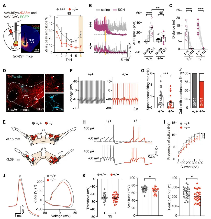为检测基础多巴胺释放水平,上述实验后,研究通过腹腔注射多巴胺探针的拮抗剂 SCH 检测发现,Scn2a+/- 小鼠的基础多巴胺水平远低于 WT 小鼠(图 8B、C)。电生理记录结果进一步证实:杂合子小鼠 VTA DAN 的自发放电频率和自发活动细胞比例均显著降低(图 8D、E、F、G),对电流注射的尖峰响应也明显下降(图 8H、I);尽管动作电位(AP)的电压阈值未改变,但 AP 上冲的峰值幅度和最大速率均显著降低(图 8J、K)。