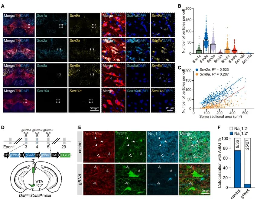 为明确 VTA 多巴胺能神经元中主导的钠通道亚型,研究团队通过定位与定量检测发现,Scn2a 的 mRNA 表达量显著高于其他钠通道亚型(图 1A、B)。进一步分析显示,Scn2a 的 mRNA 数量与神经元胞体大小呈强正相关,说明其在神经元中广泛高表达(图 1B、C)。这一系列结果从定位、定量及相关性分析多维度,直接证实 Scn2a 在 VTA 多巴胺能神经元中占据主导表达地位 ,为后续深入探究其功能奠定了重要的表达层面基础。