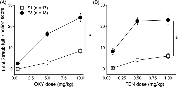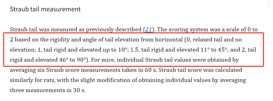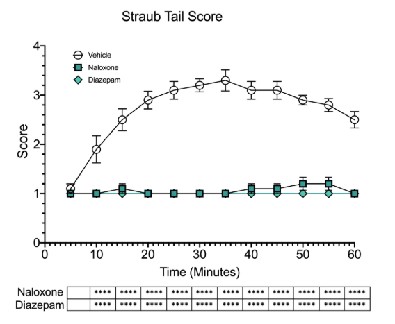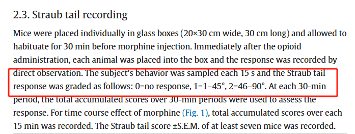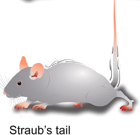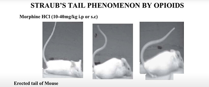 在外源性阿片类药物的给药下,啮齿动物表现出μ-阿片受体依赖性的疼痛阈值升高( 20 )和竖尾( 21 ),后者是尾巴根部骶尾肌的中央μ-阿片受体依赖性收缩,导致尾巴僵硬和抬高。
