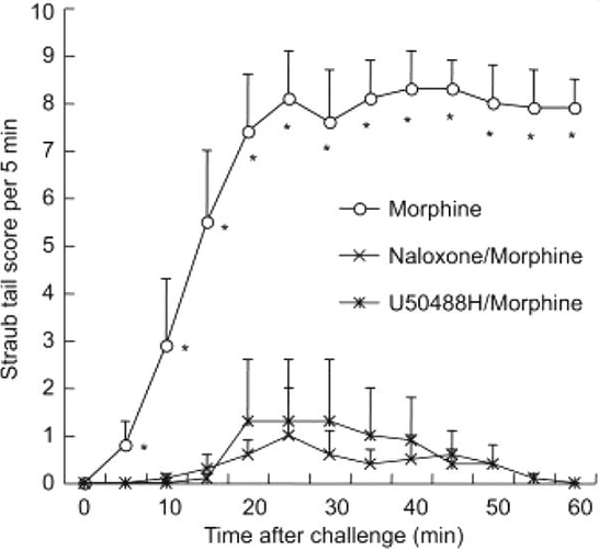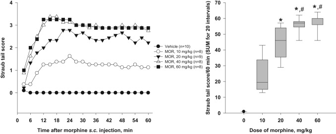 每隔 15 秒对实验对象的行为进行一次采样,并将 Straub 尾反应按以下标准分级:0 = 无反应,1 = 抬高角度 1–45°,2 = 抬高角度 46–90°。在每 30 分钟时间段内,通过 30 分钟内的总累积分数评估反应。对于吗啡的时效影响(图 1),记录每 15 分钟的总累积分数。记录至少 7 只小鼠的 Straub 尾评分 ± 标准误(S.E.M.)。