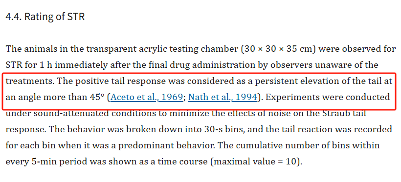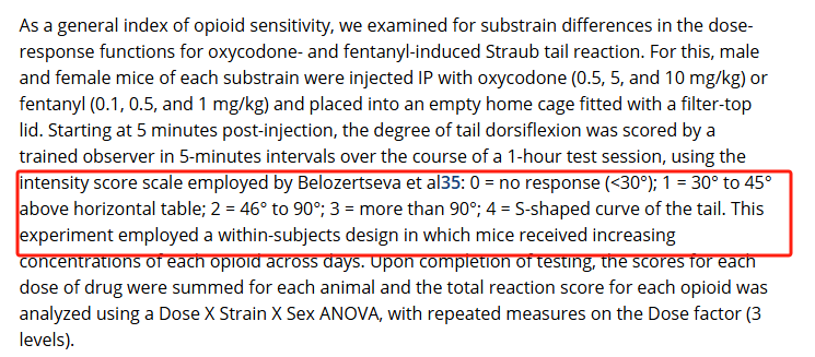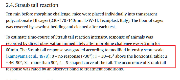 参考文献:Belozertseva, I. V., Dravolina, O. A., Tur, M. A., Semina, M. G., Zvartau, E. E., & Bespalov, A. Y. (2016). Morphine-induced Straub tail reaction in mice treated with serotonergic compounds. European journal of pharmacology, 791, 1–7. Redirecting