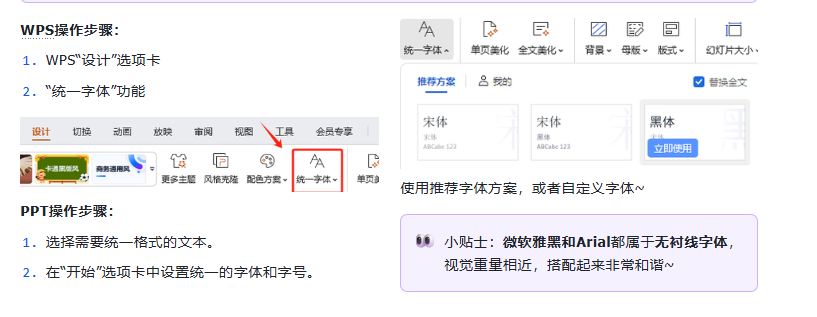 字体和字号的统一是PPT整齐大方、避免视觉错位的重要手段,建议在制作PPT的过程中,注重字体的统一,推荐使用WPS的“统一字体”功能