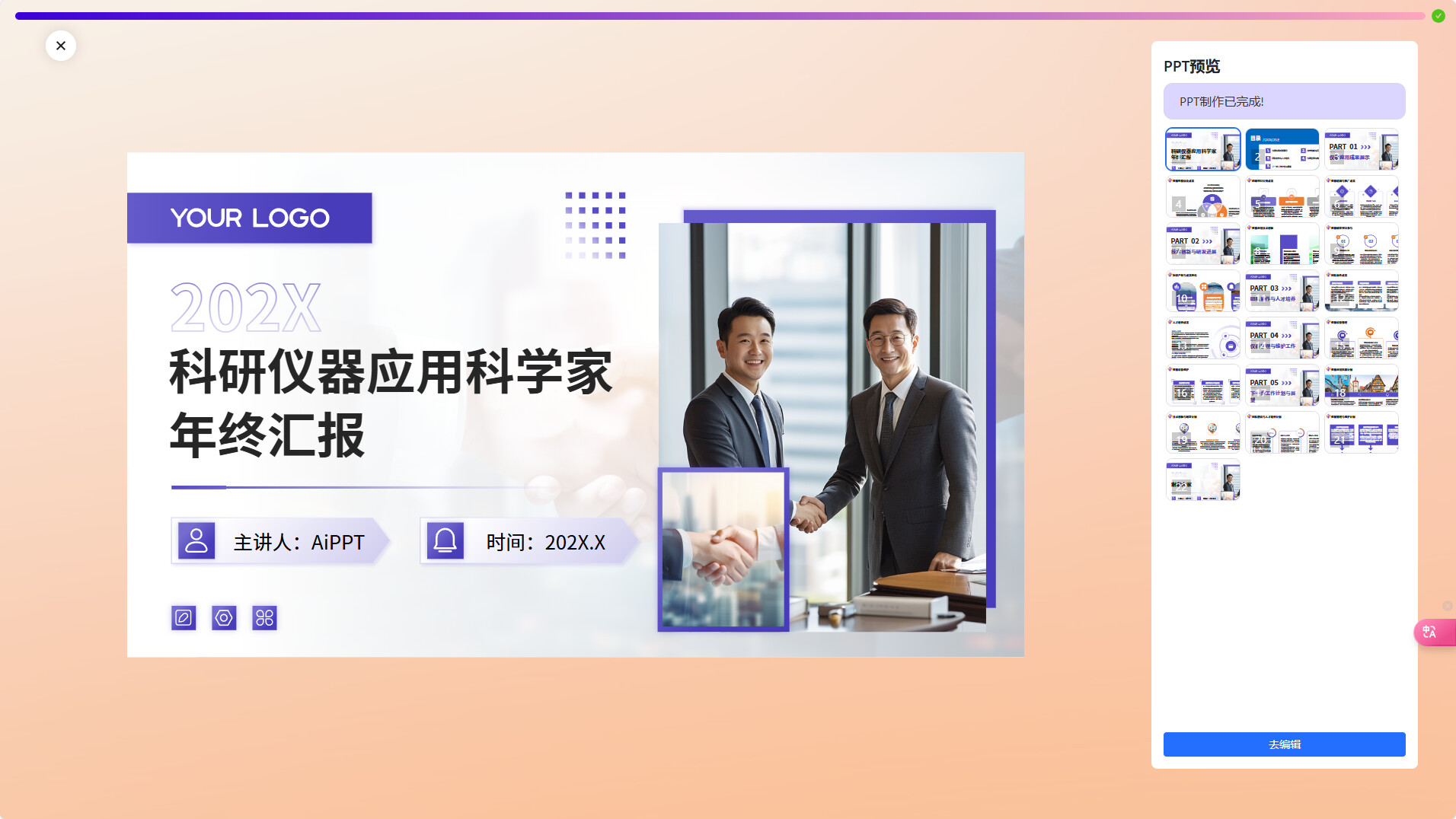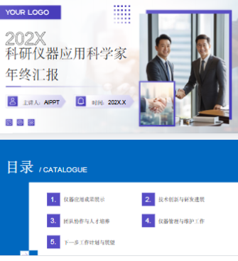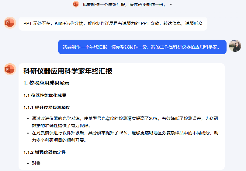 我输入的文字是:我要制作一个年终汇报,请你帮我制作一份,我的工作是科研仪器的应用科学家
