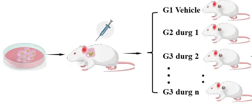 异位移植:将肝癌细胞或肿瘤组织块移植到实验动物的皮下、腹腔等部位。例如,Balb/c nude 小鼠皮下注射 HepG2 细胞,构建皮下肝癌模型(图 4)。种瘤 10 天后,动物肿瘤体积达到 100mm3,随后可分组给药进行药效评估。