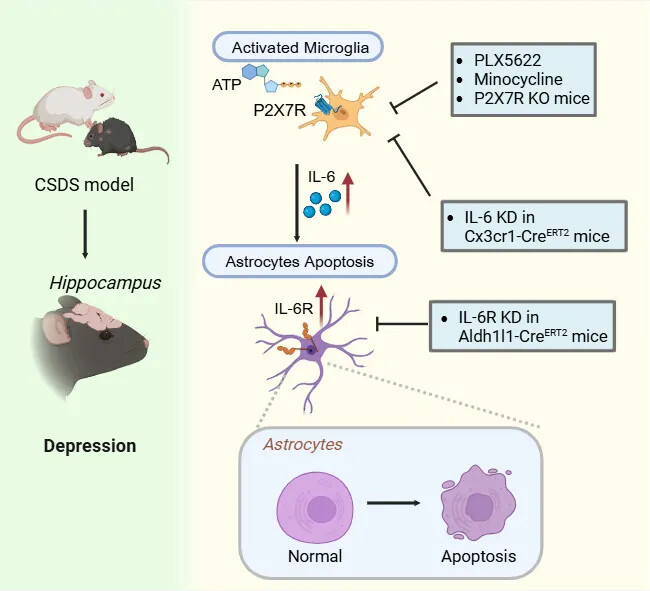 复旦大学俞瑾教授、张玉秋教授团队在 Advanced Science 上的研究发现,CSDS 应激后,海马区小胶质细胞被显著激活,并释放大量的白细胞介素-6(IL-6)。这些 IL-6 会作用于星形胶质细胞,触发其萎缩与凋亡,最终导致抑郁样行为的产生。该研究清晰地勾勒出“小胶质细胞 → IL-6 → 星形胶质细胞 → 行为表型”的因果链条。本项研究为临床治疗抑郁症提供了潜在靶点。