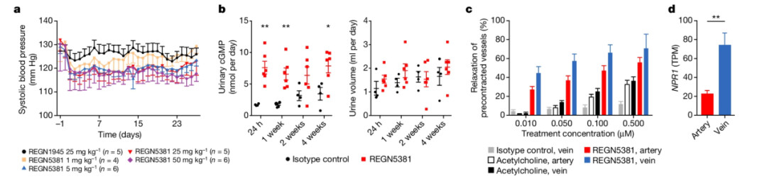 实验数据表明,体外实验以及通过小鼠、比格犬和食蟹猴等动物模型进行的在体实验中,REGN5381 药物均展现出了对血管的扩张效应。值得注意的是,这种扩张作用在静脉系统中比在动脉系统中表现得更为突出。进一步观察发现,REGN5381 治疗显著促进了 cGMP(环磷酸鸟苷)的生成,且在小鼠实验中,当给予最高剂量时,其降压效果能够持续长达28天之久。并且,当REGN5381与血管紧张素转换酶抑制剂或血管紧张素受体阻滞剂联合应用时,展现出了增强的协同降压效果。