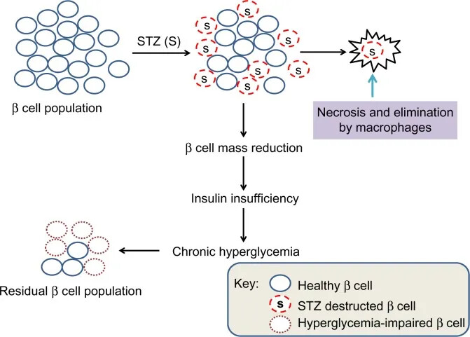 建模方法:通过腹腔注射链脲佐菌素(Streptozotocin, STZ),利用其 β 细胞毒性,选择性破坏胰腺胰岛 β 细胞,导致胰岛素分泌的绝对缺乏。