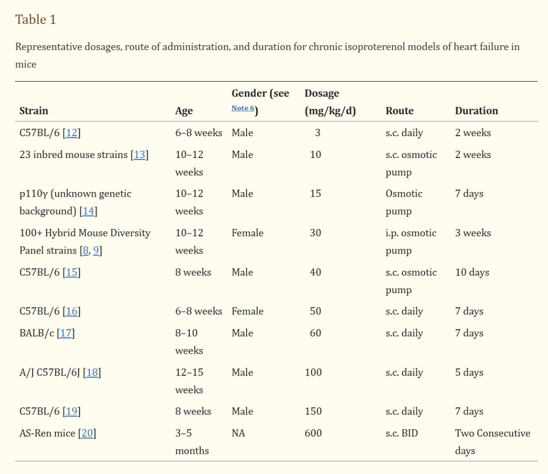 此外,常用的异丙肾上腺素诱导模型还需要进行复杂的给药剂量和周期的摸索。Sunny C. Chang 对于该方法进行了统计汇总,从文中我们不难得知针对不同品系、不同周龄、不同性别的小鼠,药物的注射方式都有较大差别,即使是同一种小鼠品系不同文献报道间也存在差异,因此,每一个独立实验室在建立模型时都必须进行预实验。