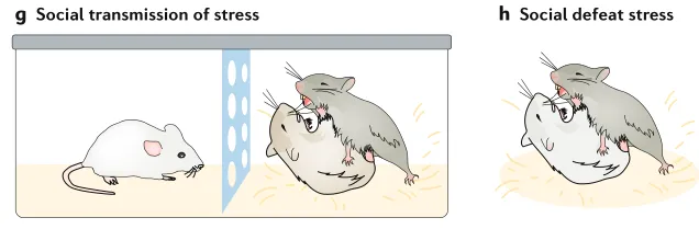 - 心理威胁阶段(24 小时):随后,实验鼠和 CD-1 小鼠共同饲养在同一个笼盒内,但居住地用带孔的透明隔板将其隔开。实验鼠虽免受直接攻击,但视觉、听觉和嗅觉各个感官层面上仍暴露于“施暴者”的威胁,从而心理应激亦持续强化。