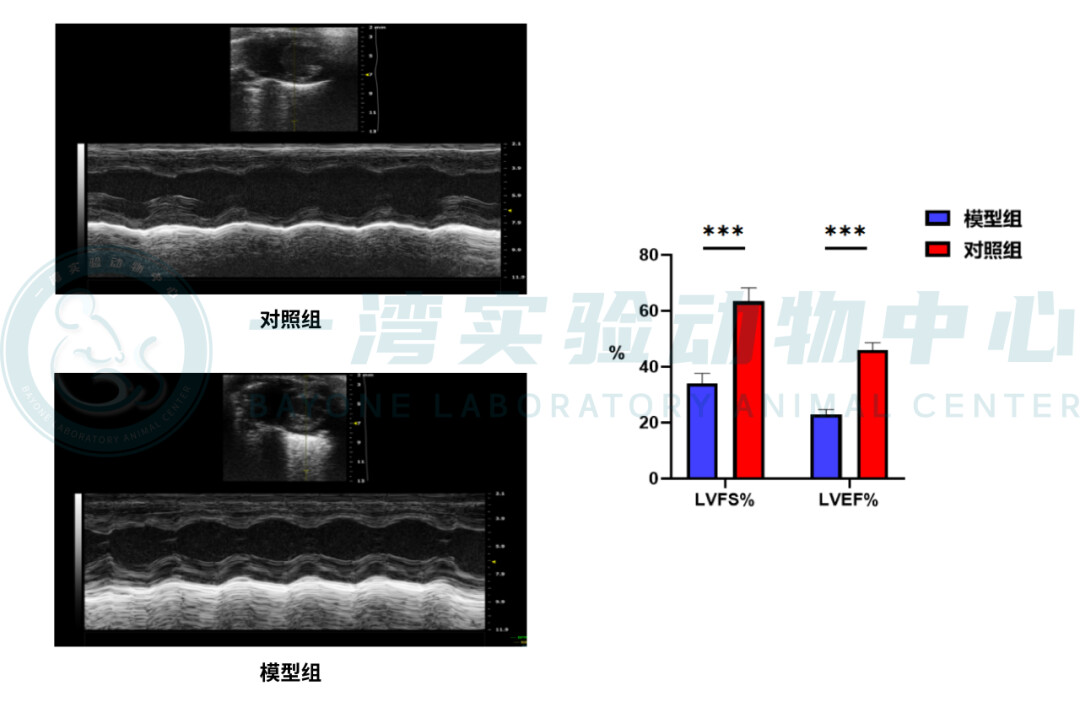 心脏超声检查是评估小鼠心功能变化的重要手段。通过测量左心室射血分数(EF)、左心室收缩末期内径(LVESd)、左心室舒张末期内径(LVEDd)以及左心室短轴缩短率(FS)等参数。本中心的数据显示,与正常小鼠进行对比,模型小鼠通常表现出 EF 和 FS 值显著降低的超声心动图特征。