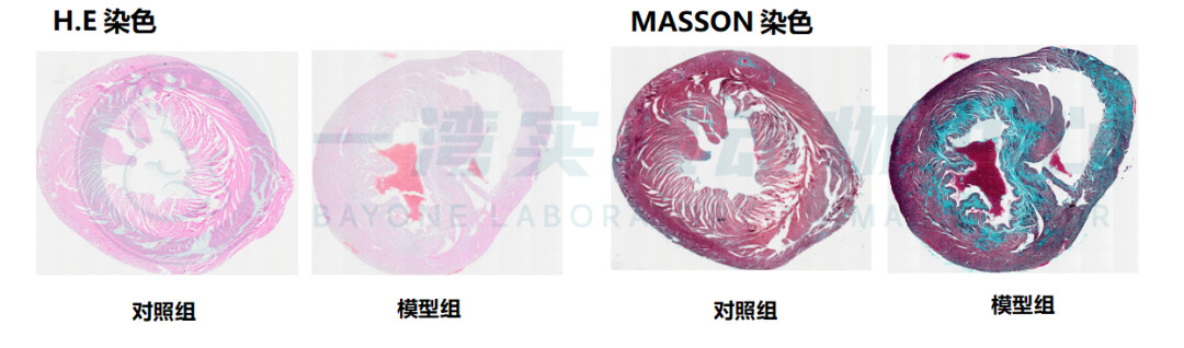 本中心对小鼠心脏进行病理组织学检查,与对照组相比,模型小鼠的心脏组织通常表现出心肌细胞排列紊乱、间质纤维化等病理特征,同时伴有心肌细胞变性、坏死、肥大等病理变化。