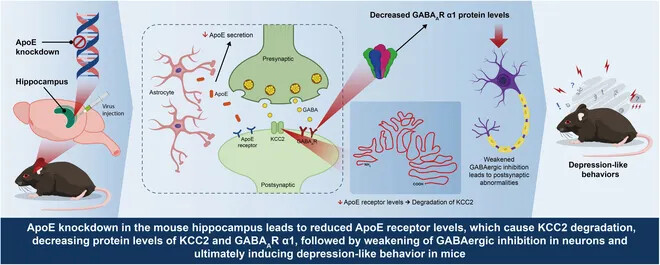 浙江省人民医院叶祥明教授团队与安徽医科大学合作在 Research 发表研究,首次揭示海马区 ApoE 通过调控 KCC2 表达维持 GABA 突触功能,进而影响应激诱导的小鼠抑郁样行为的可能分子机制。研究发现,CSDS 导致海马区 ApoE 表达下调,进而降低 KCC2 稳定性,损害 GABA 能抑制功能,诱发抑郁行为;而激活海马 GABA 能神经元、增强 KCC2 功能或过表达 ApoE 均可显著逆转上述病理表型。该研究阐明了 ApoE-KCC2 通路在抑郁中的关键作用,为抗抑郁药物研发提供了新靶点。