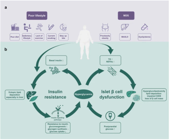 表型特征:肥胖(饮食及遗传模型)、食欲亢进;核心特征为胰岛素抵抗和代偿性高胰岛素血症,随病程进展逐渐出现高血糖;后期可伴随 β 细胞功能衰竭,出现糖尿病并发症。